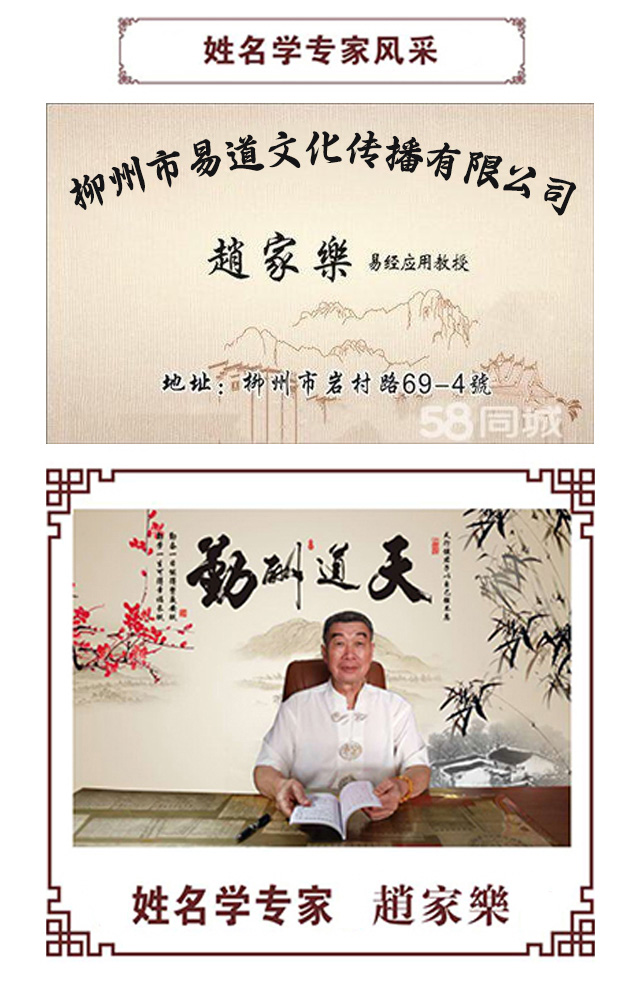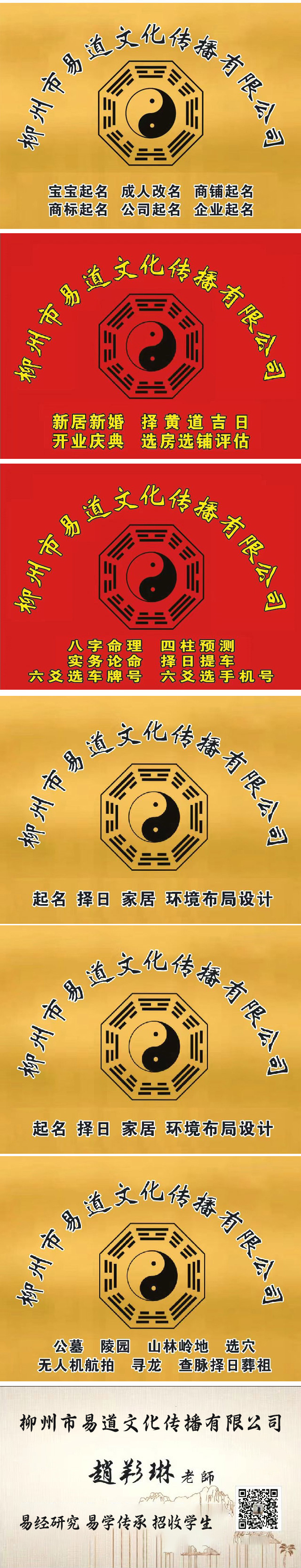 1、宝宝起名、成人改名、店铺取名、公司起名、商标起名、商标设计、测名、改名、评名,您可以选择到公司门面取名和微信取名两种方式。 2.、家居环境、店铺住宅、公司、工厂布局和设计(选房选铺)。 3、精批八字、事业运程。五年规划、三年计划。 4、选好日子:进新房子,嫁娶结婚,开张开业,庆典择日,黄道吉日。 5、易经六爻,选車牌号、评車牌号,选手机号、评手机号,评日课。 6、形势地理头一遭,中华龙神藏化妙,航拍科技现原貌,以新科技寻龙查脉,柳州市**持证飞行-无人机航拍,寻龙查脉,我们是专业的。 我们的使命:弘扬国学文化,复兴中华文明,造福人类社会。