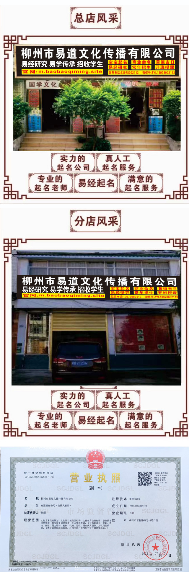 1、宝宝起名、成人改名、店铺取名、公司起名、商标起名、商标设计、测名、改名、评名,您可以选择到公司门面取名和微信取名两种方式。 2.、家居环境、店铺住宅、公司、工厂布局和设计(选房选铺)。 3、精批八字、事业运程。五年规划、三年计划。 4、选好日子:进新房子,嫁娶结婚,开张开业,庆典择日,黄道吉日。 5、易经六爻,选車牌号、评車牌号,选手机号、评手机号,评日课。 6、形势地理头一遭,中华龙神藏化妙,航拍科技现原貌,以新科技寻龙查脉,柳州市**持证飞行-无人机航拍,寻龙查脉,我们是专业的。 我们的使命:弘扬国学文化,复兴中华文明,造福人类社会。